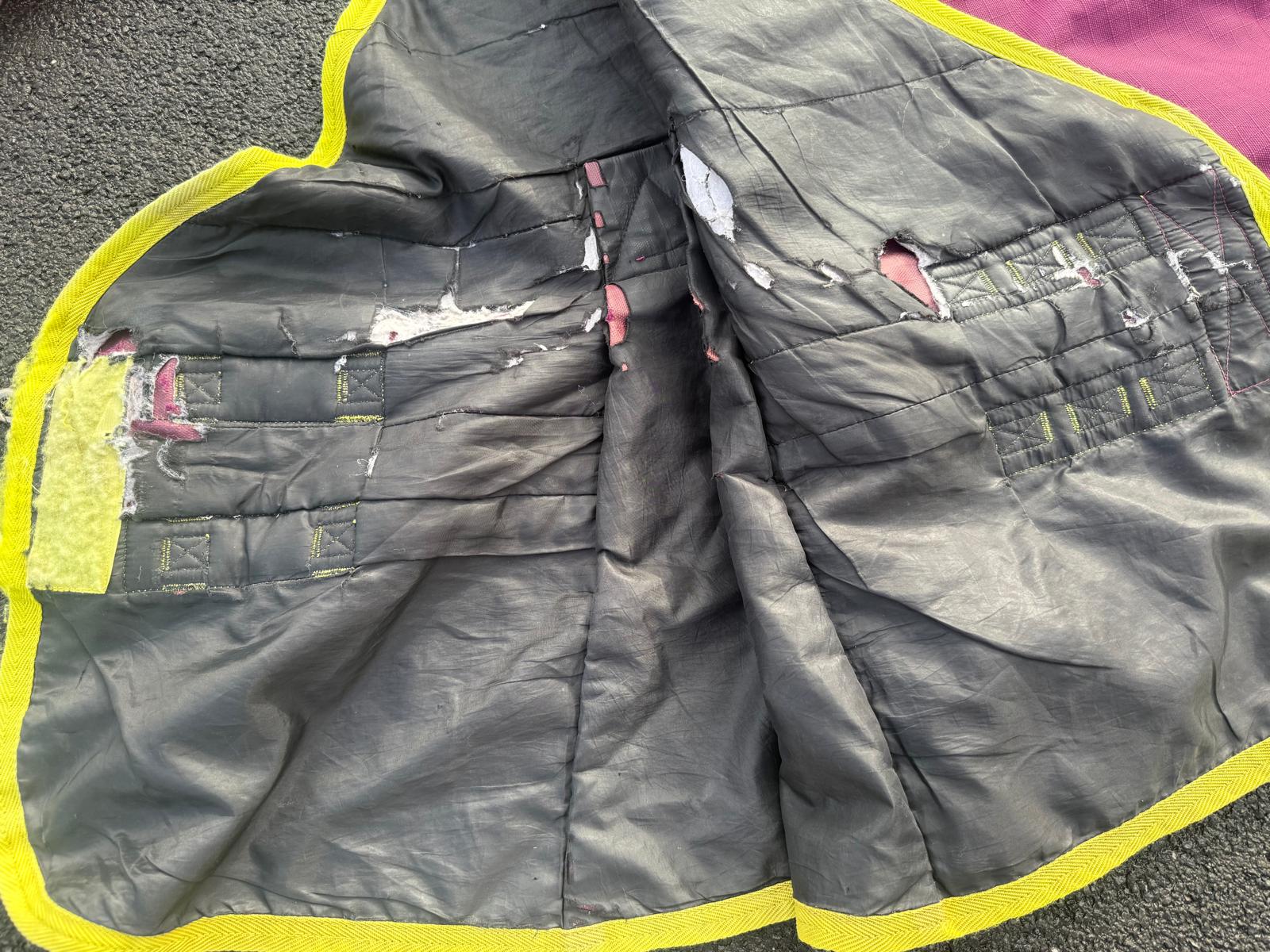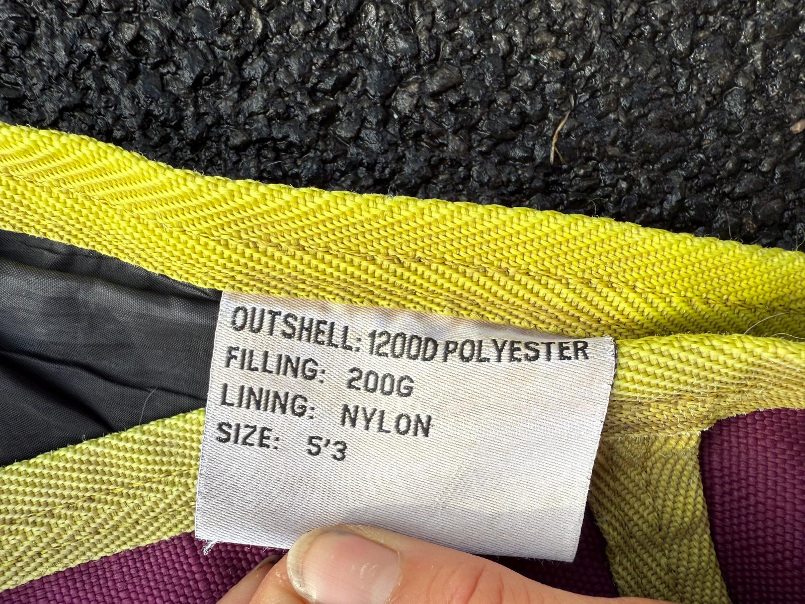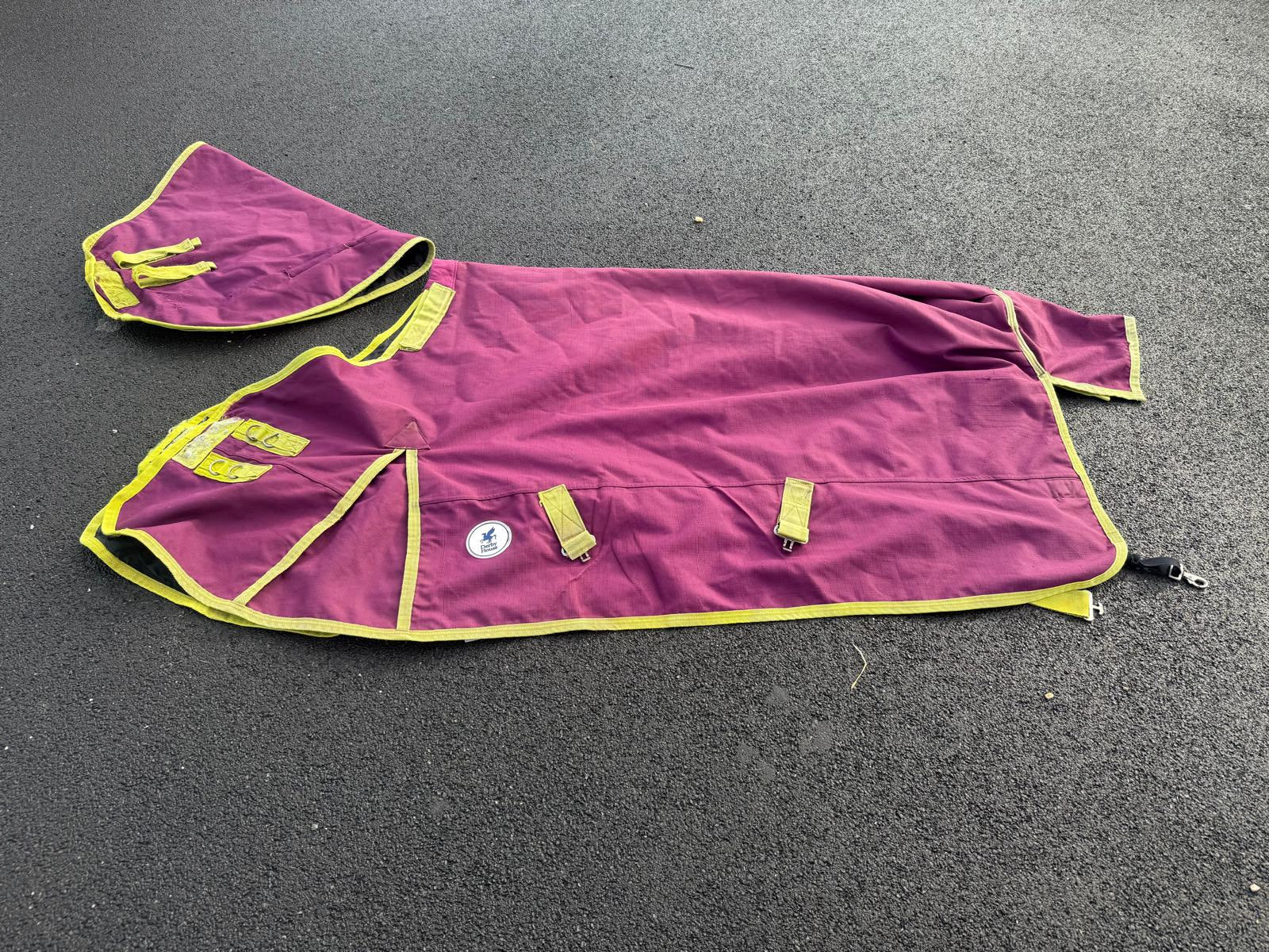 A really good vibrant turnout rug with durable outer shell is well used but with wear to lining as shown, has had a repair to the out are and has some expected snags to the lining. Has a detachable neck. Clean and ready to use.