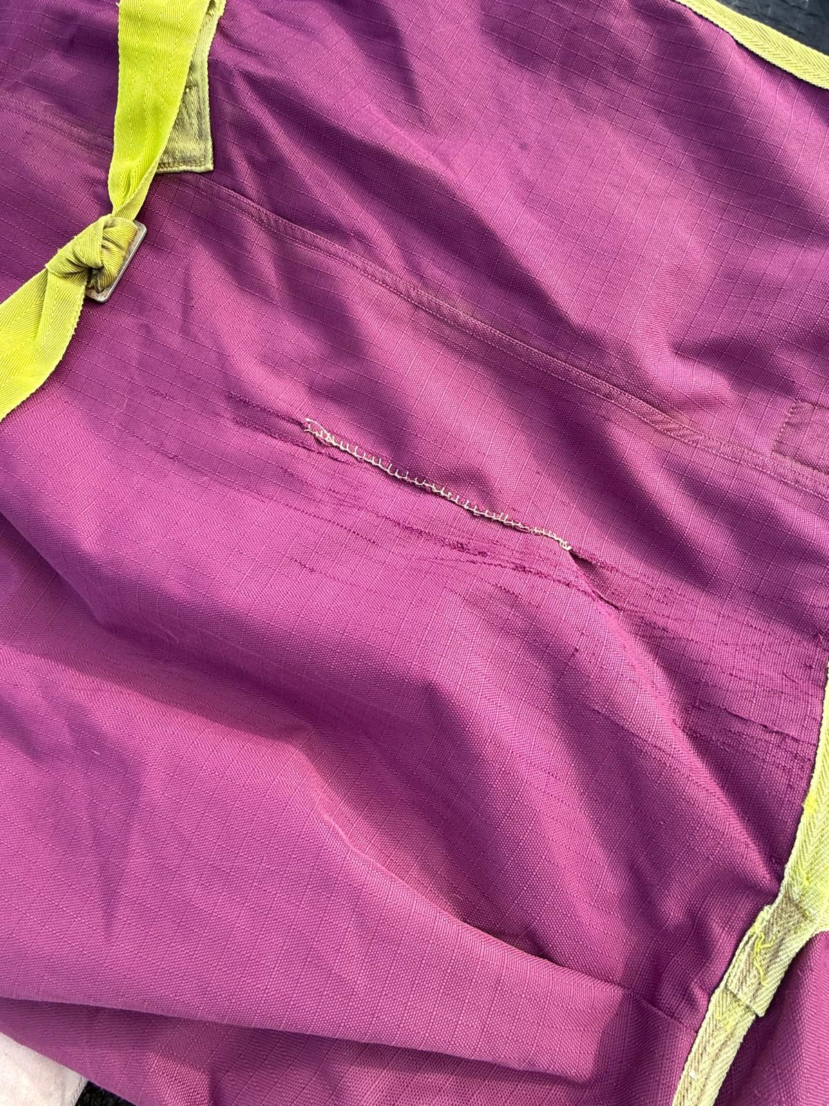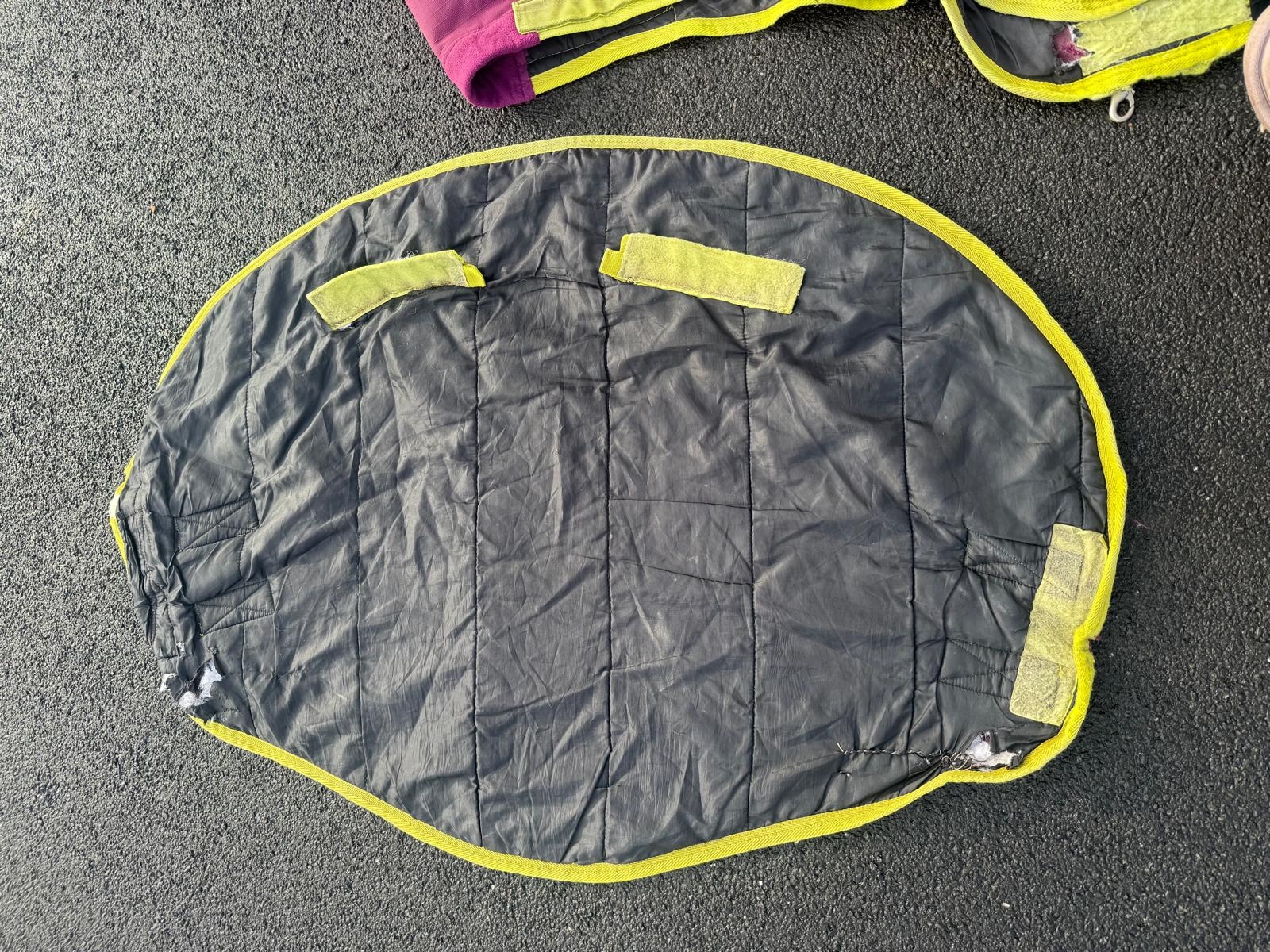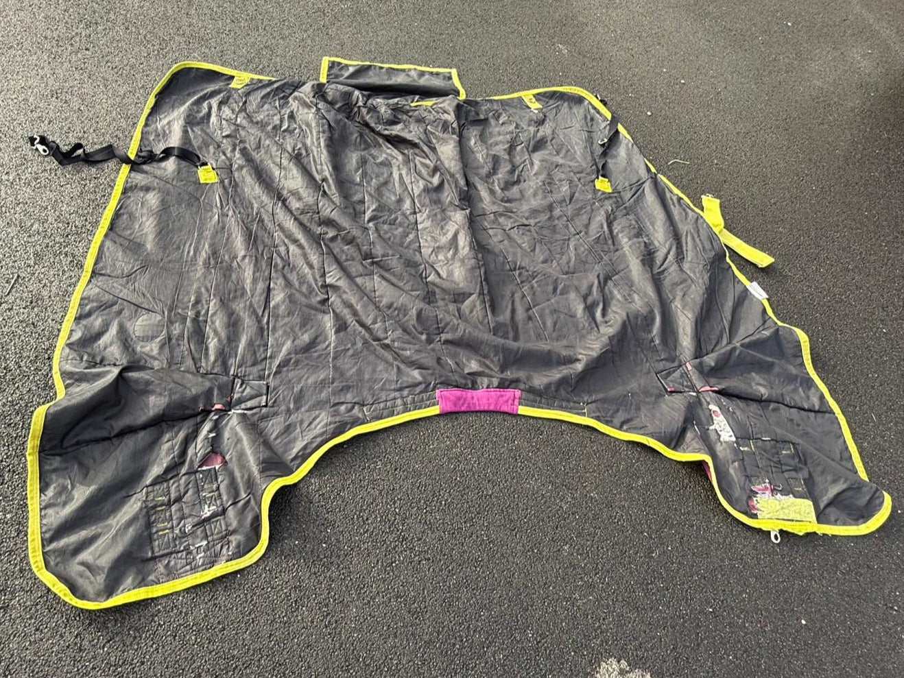 A really good vibrant turnout rug with durable outer shell is well used but with wear to lining as shown, has had a repair to the out are and has some expected snags to the lining. Has a detachable neck. Clean and ready to use.