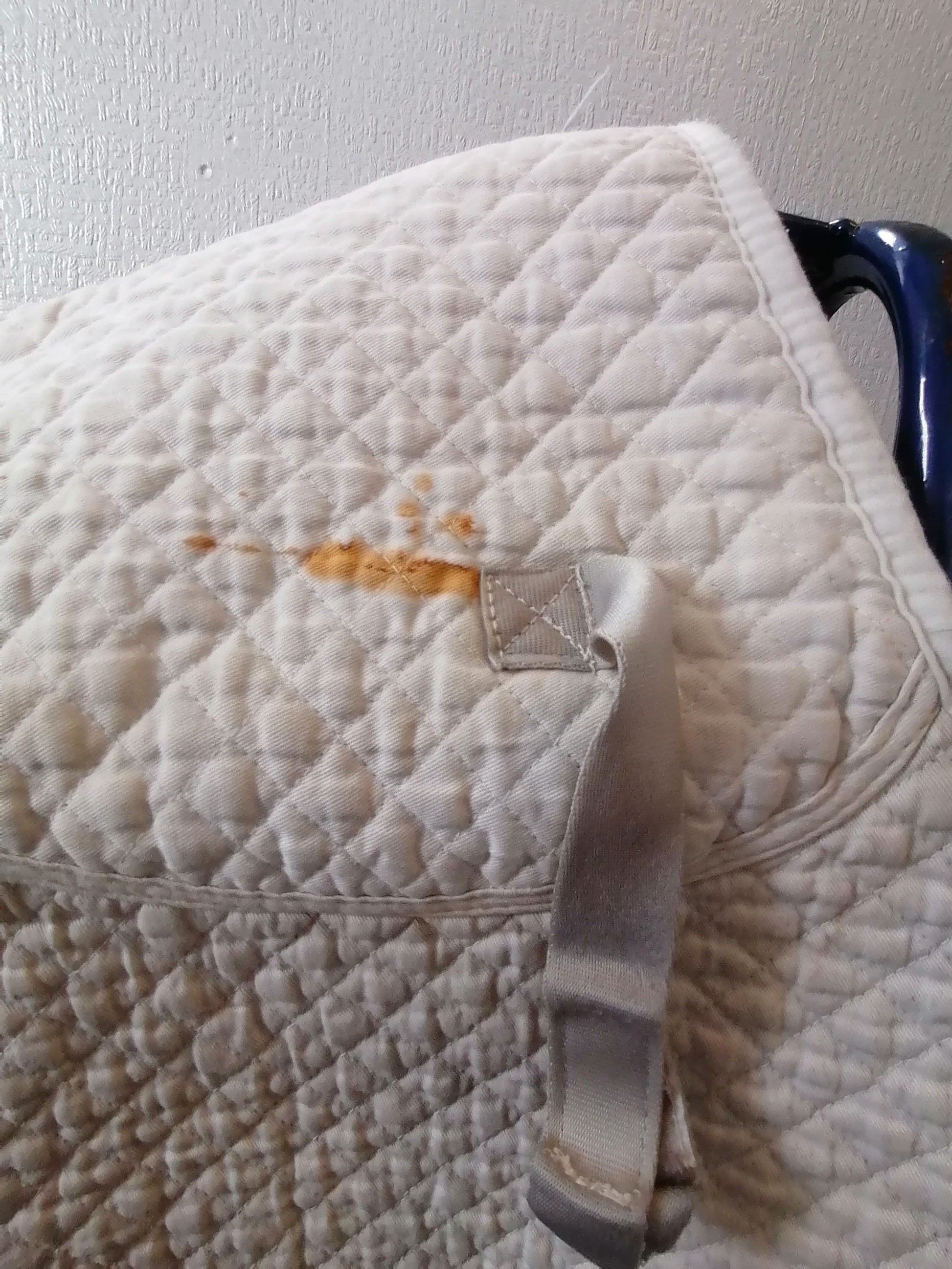 Very well used with some larger stains that are covered by a saddle. No damage to any of the pad and has been washed ready to go. No label for size but would fit cob/full as quite large