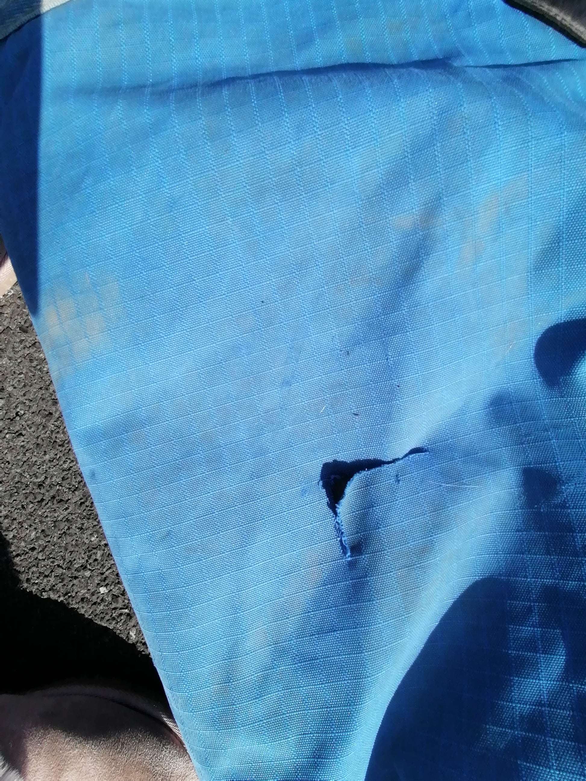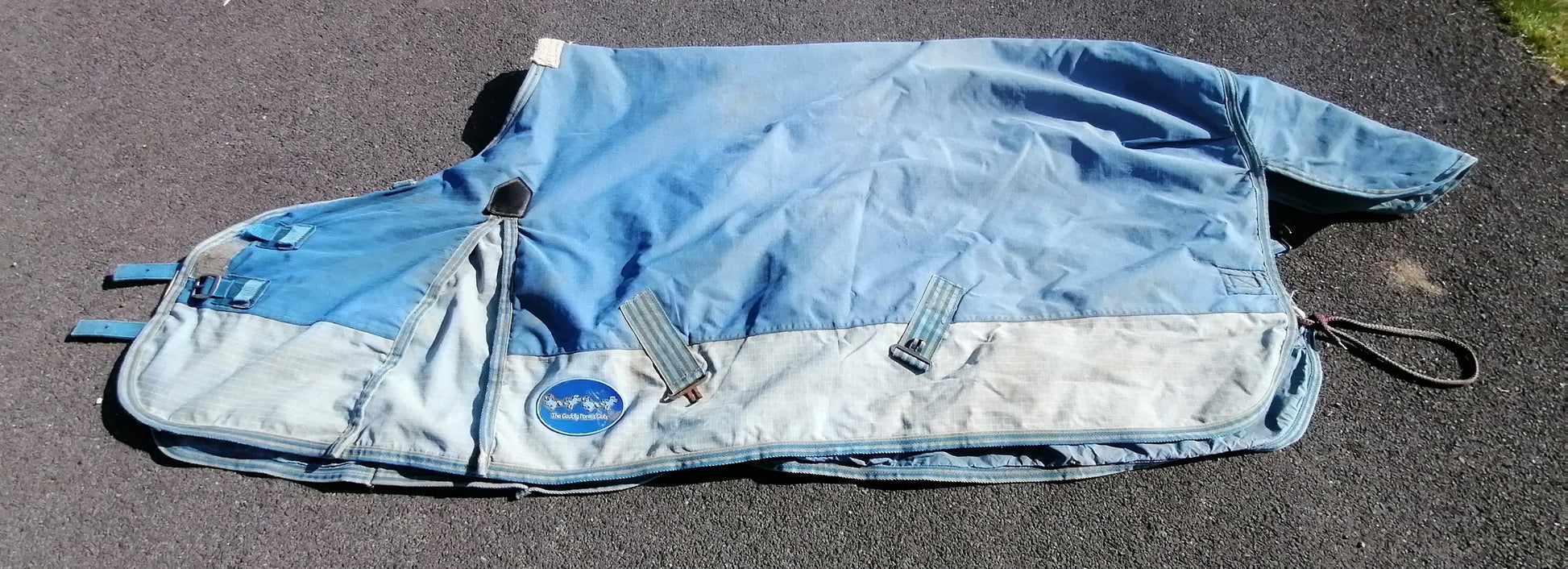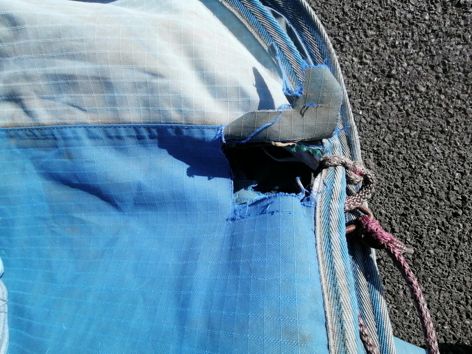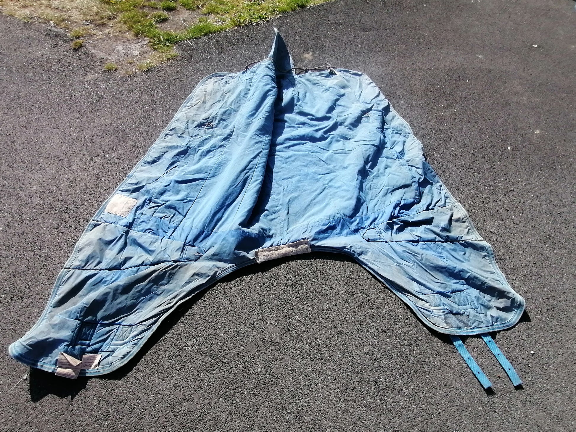 Some filling would be around 100g/150g well used as shown does have a small tear to shoulder and where tail strap attaches, Great for a rug wrecker as still in useable condition. Some rust to the fittings, fillet string fitted not original.