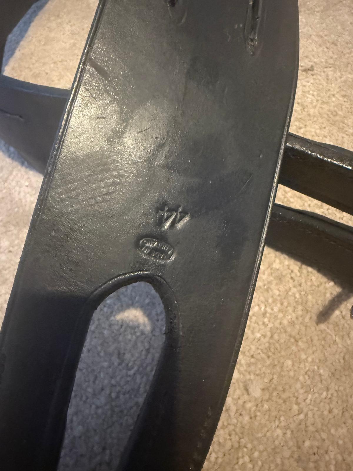 A very dark Havana brown leather girth. Stamped 44” and made in England. Is an older style of girth but not damaged is not elasticated, clean good quality ready to post.