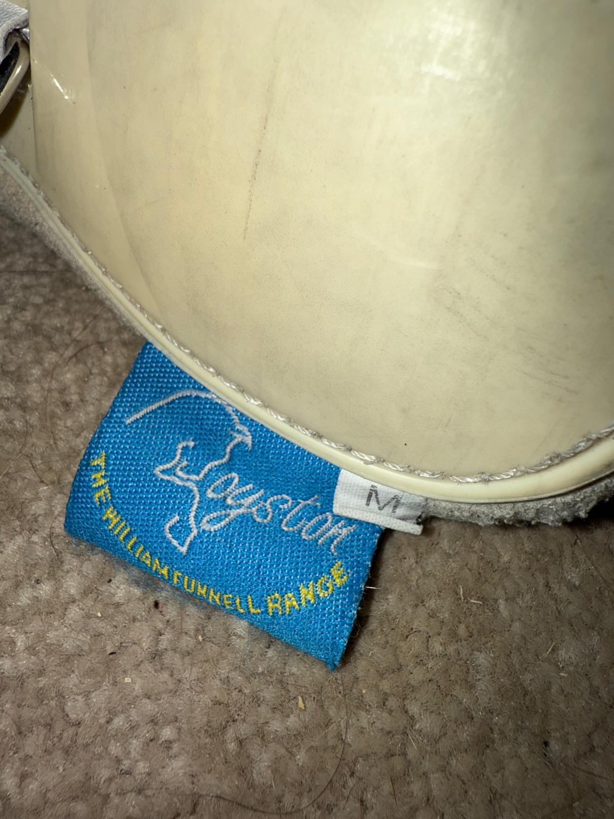 Funnell Tendon Boots Medium sized. Older style boots designed by the Funnells Size medium sturdy boots with soft padded suede to the inside. Has strong loop fastening, have been cleaned but are discoloured due to age.