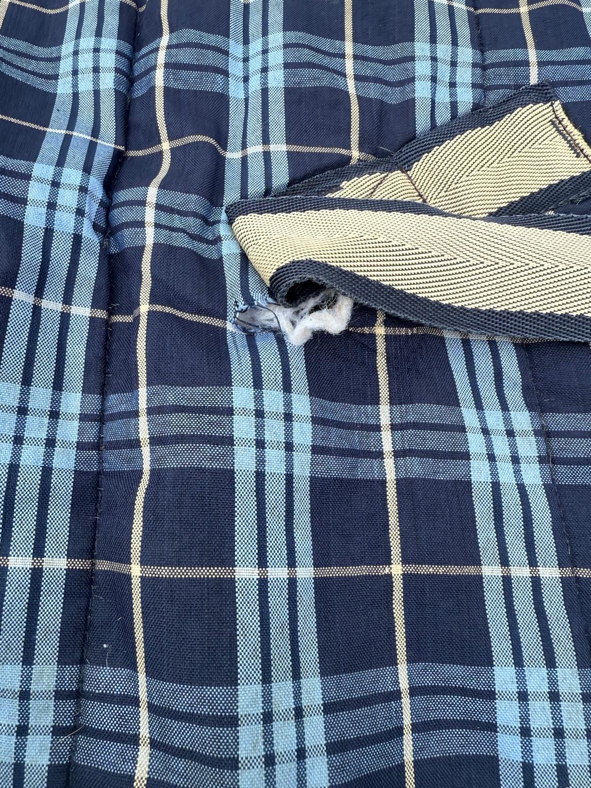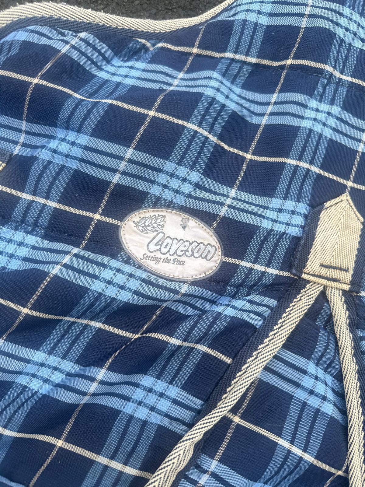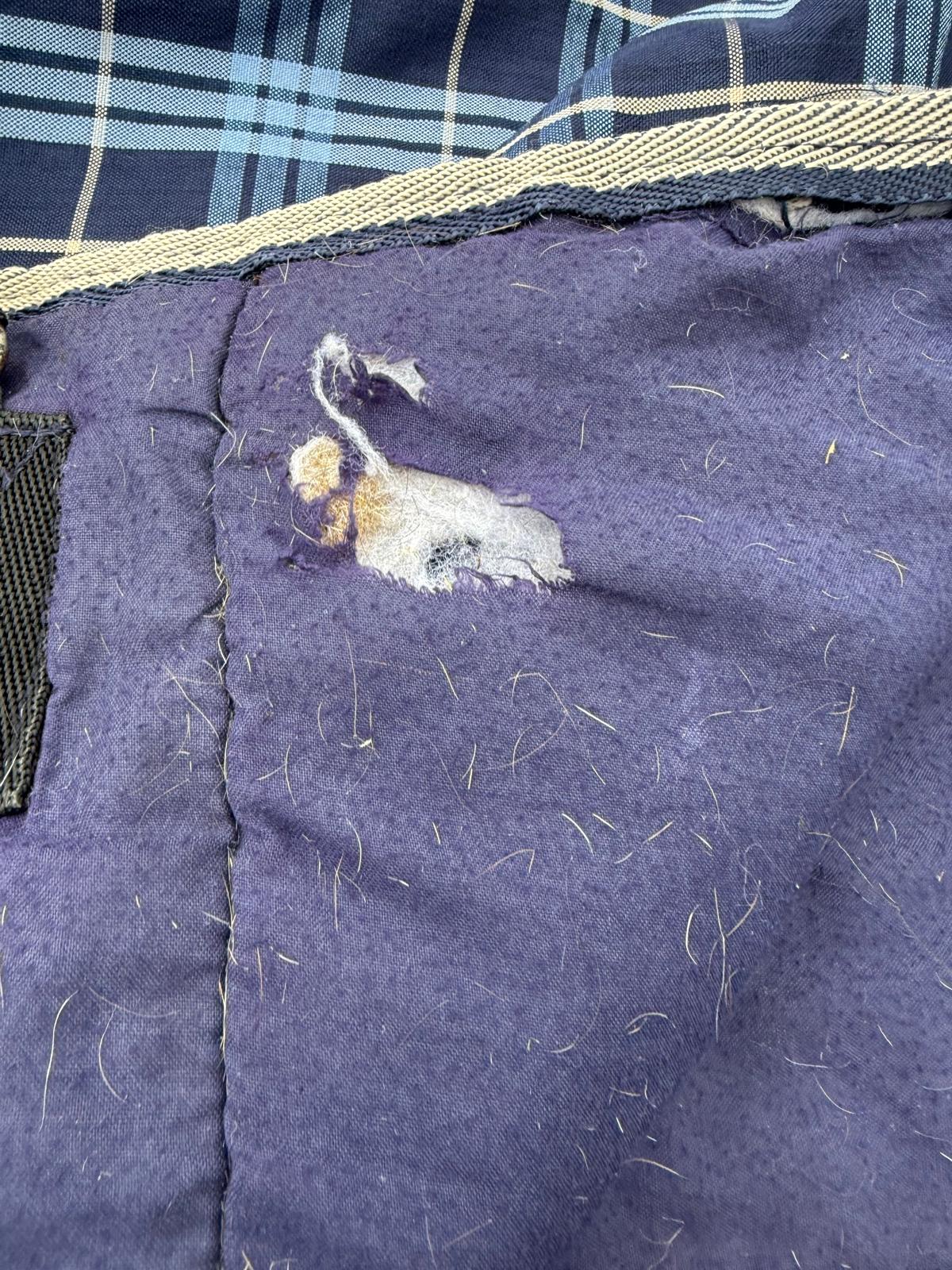 A great everyday stable rug or liner. Well used as shown in pictures has some tears to the ling and next to one of the surcingle's that does not effect use. Clip to tail strap would need replacing. Has been washed does still have some loose hairs we will try to remove before posting.