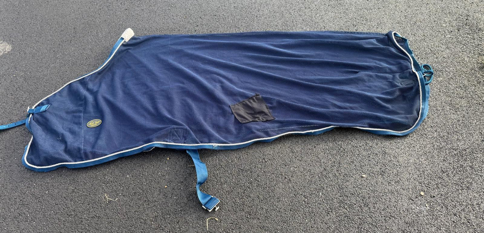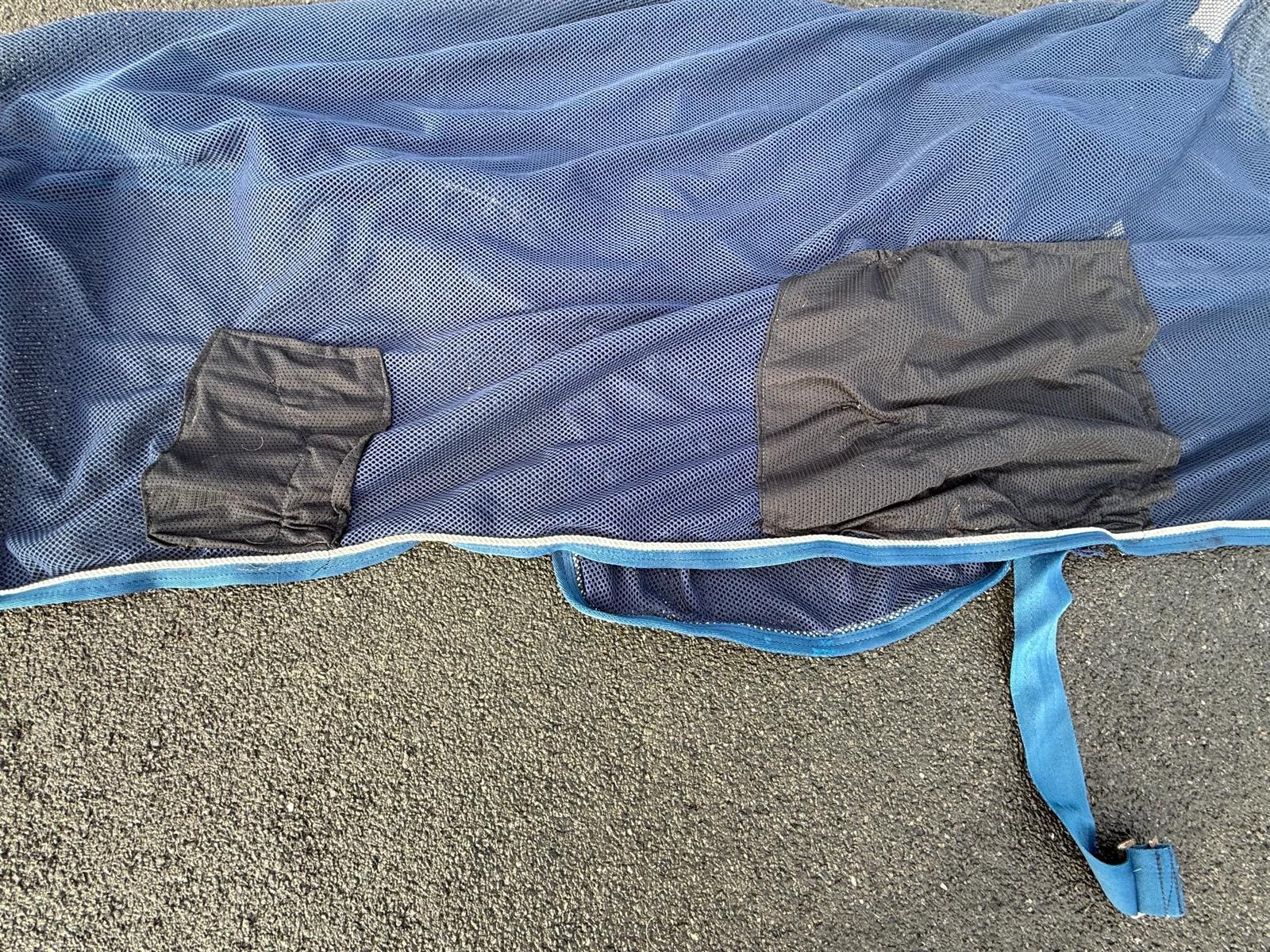 Well used rug that has had some large repairs to both sides. Safe to use and great for after hard work to help aid wicking. Some rust to buckles and surcingle's but all are functioning. Clean and ready to post.