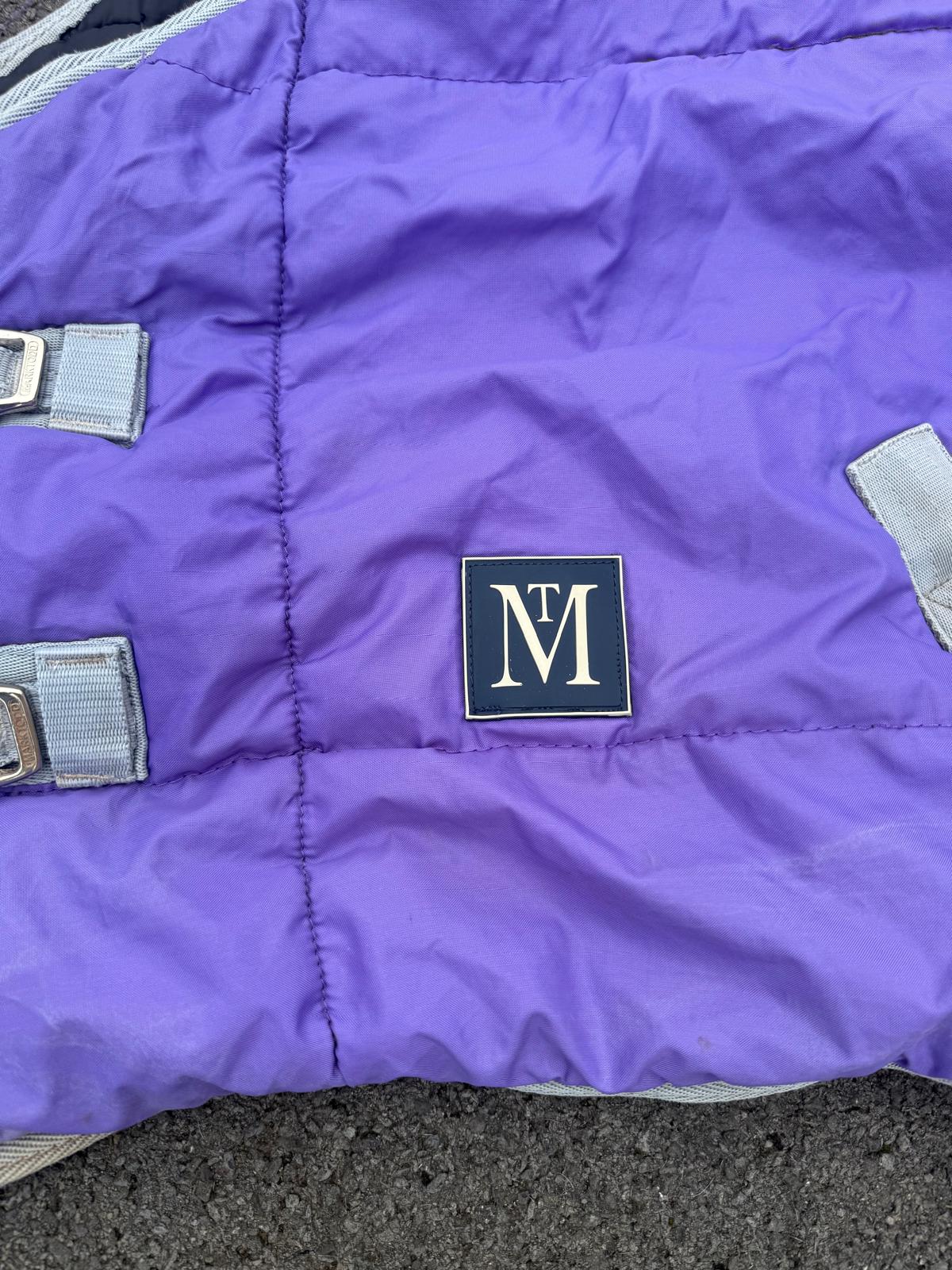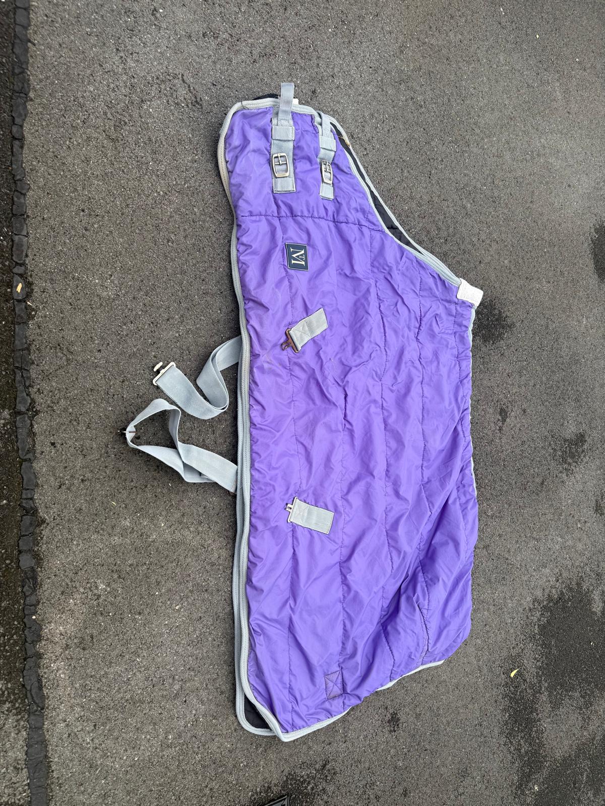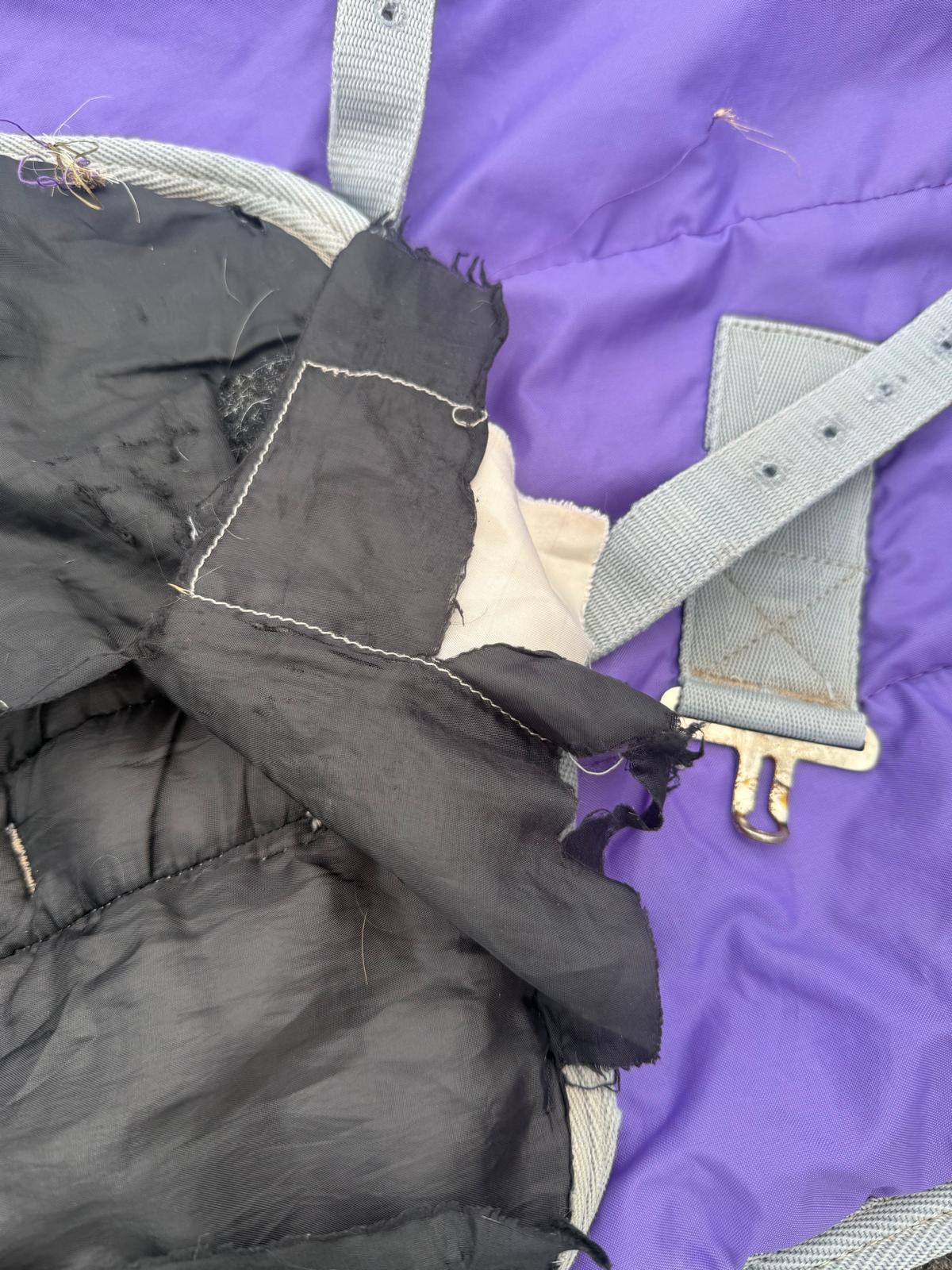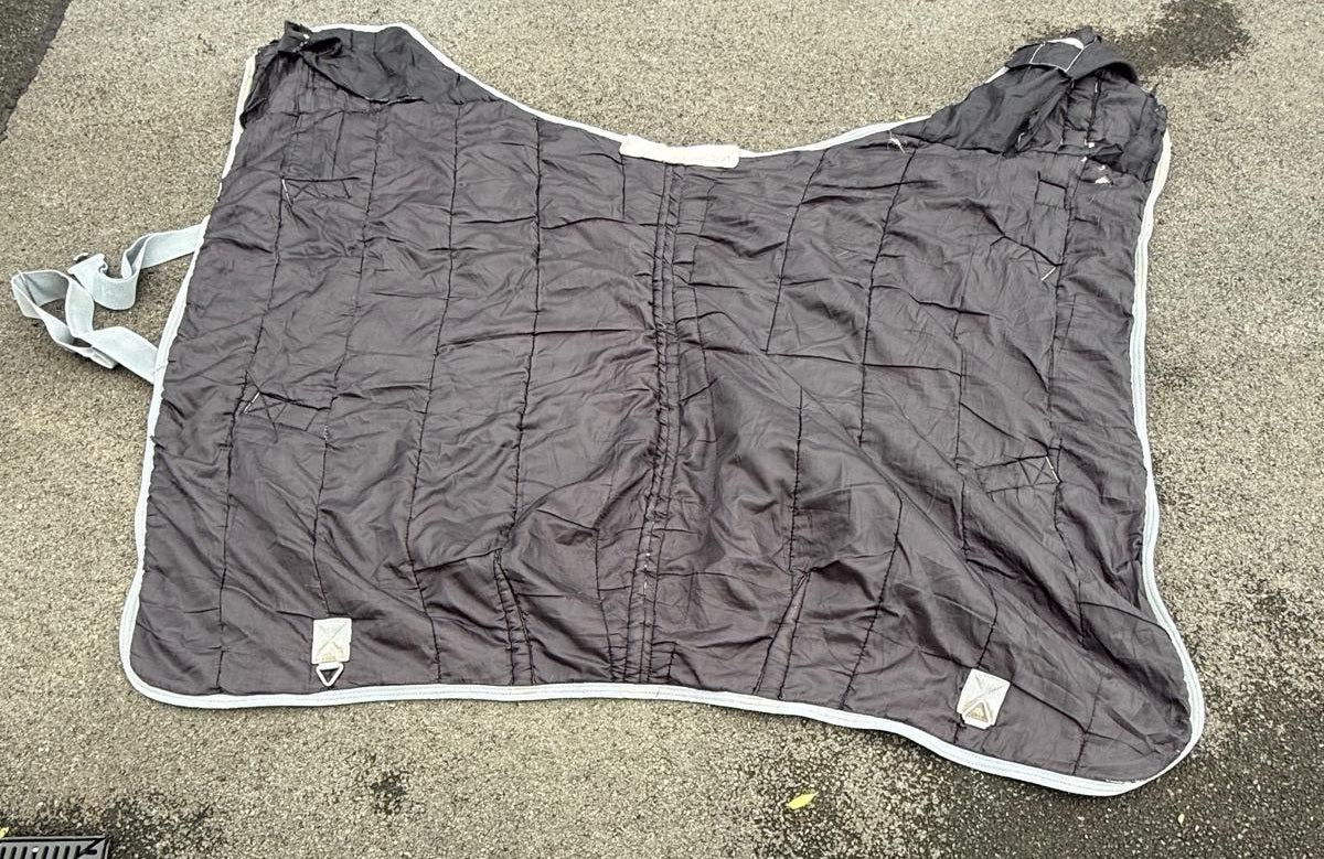 A smart quality little rug ideal as a spare or an extra layer in good condition mainly but does have rips to the lining at the chest and will need a tail strap. Chest closure is functioning but as shown clips have broken and are being used to thread strap to the buckles. Clean and ready to post.