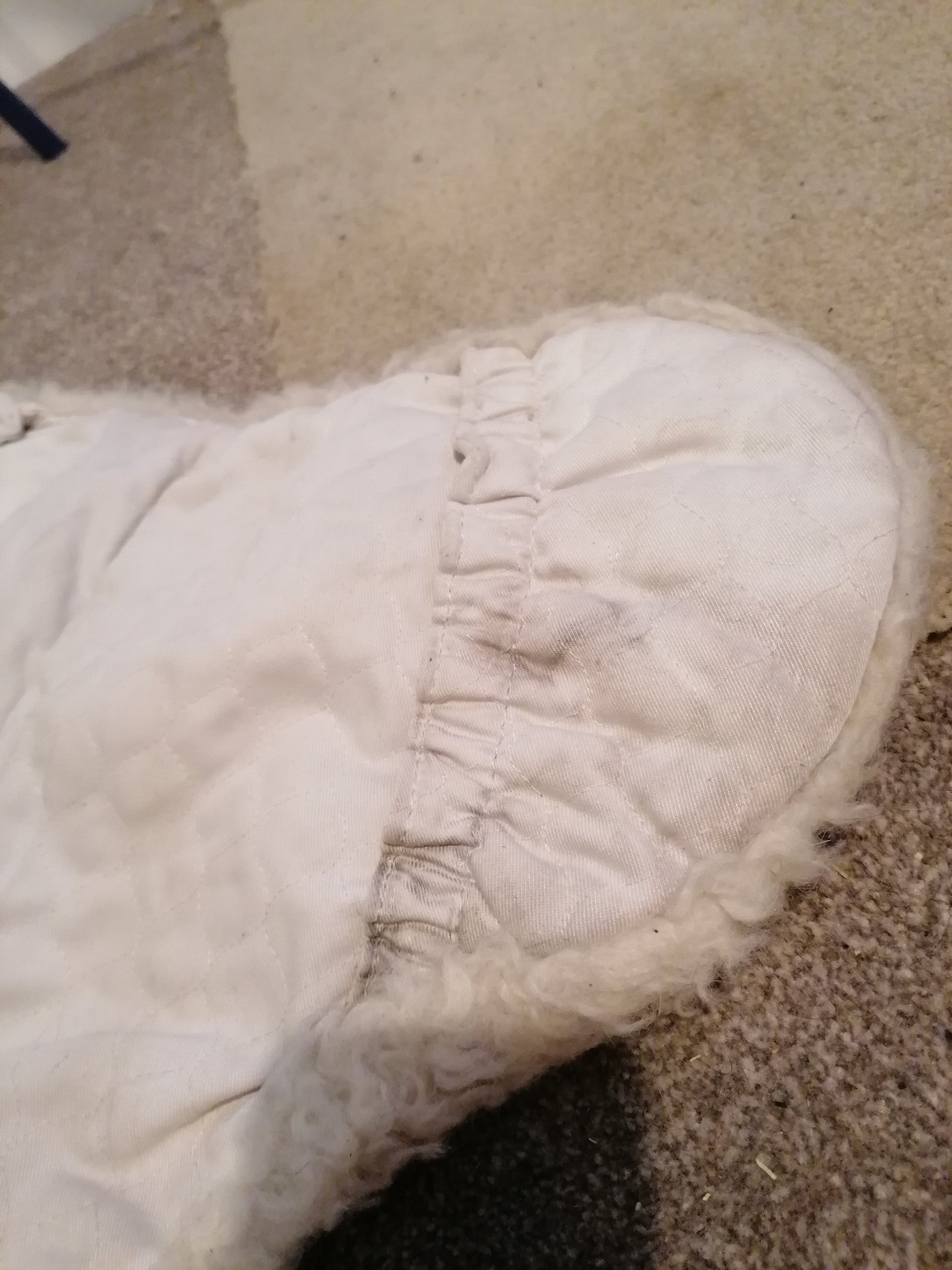 Lovely quality sheepskin, has some marks and discolouration as shown but does not effect use and is not noticeable when in use. Would fit up to 17” saddles with ease could fit bigger depending on saddle. Clean and ready for use.