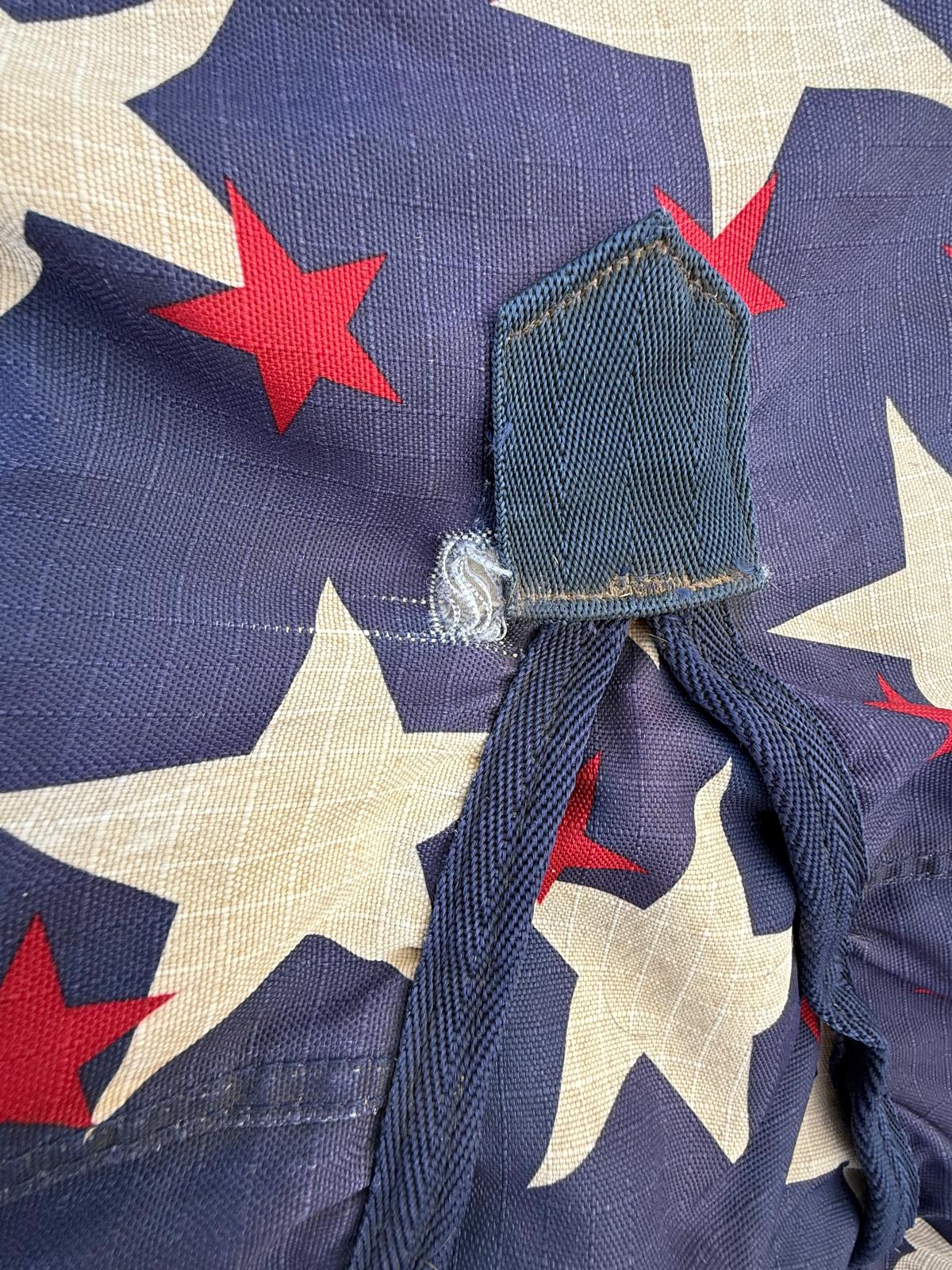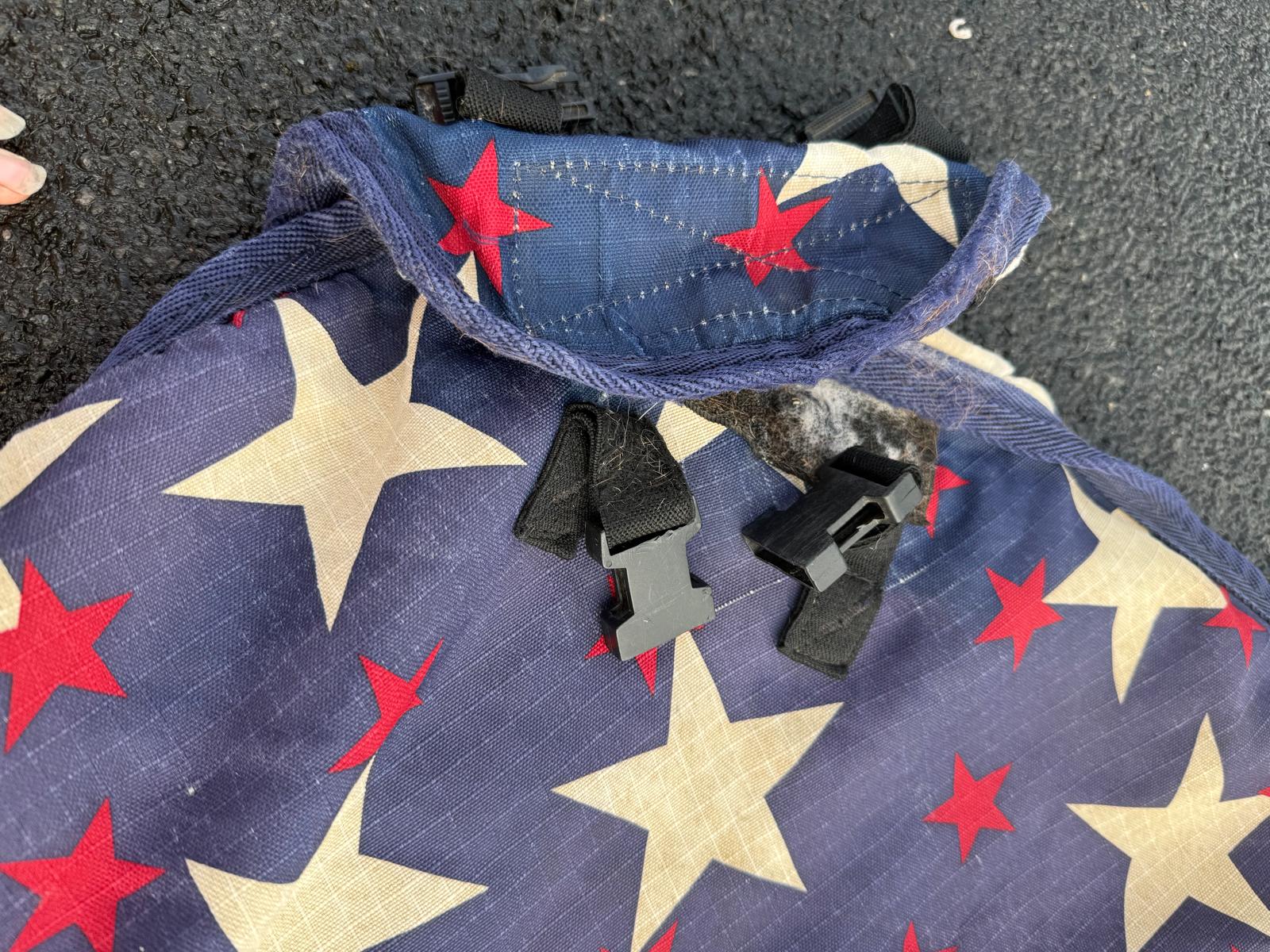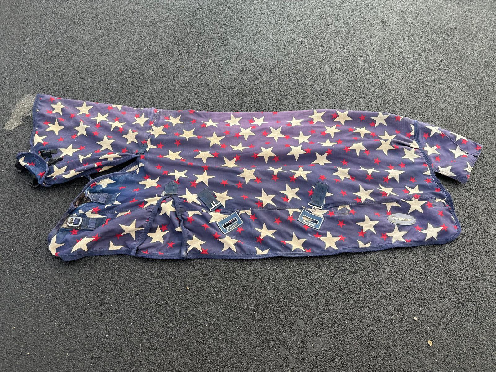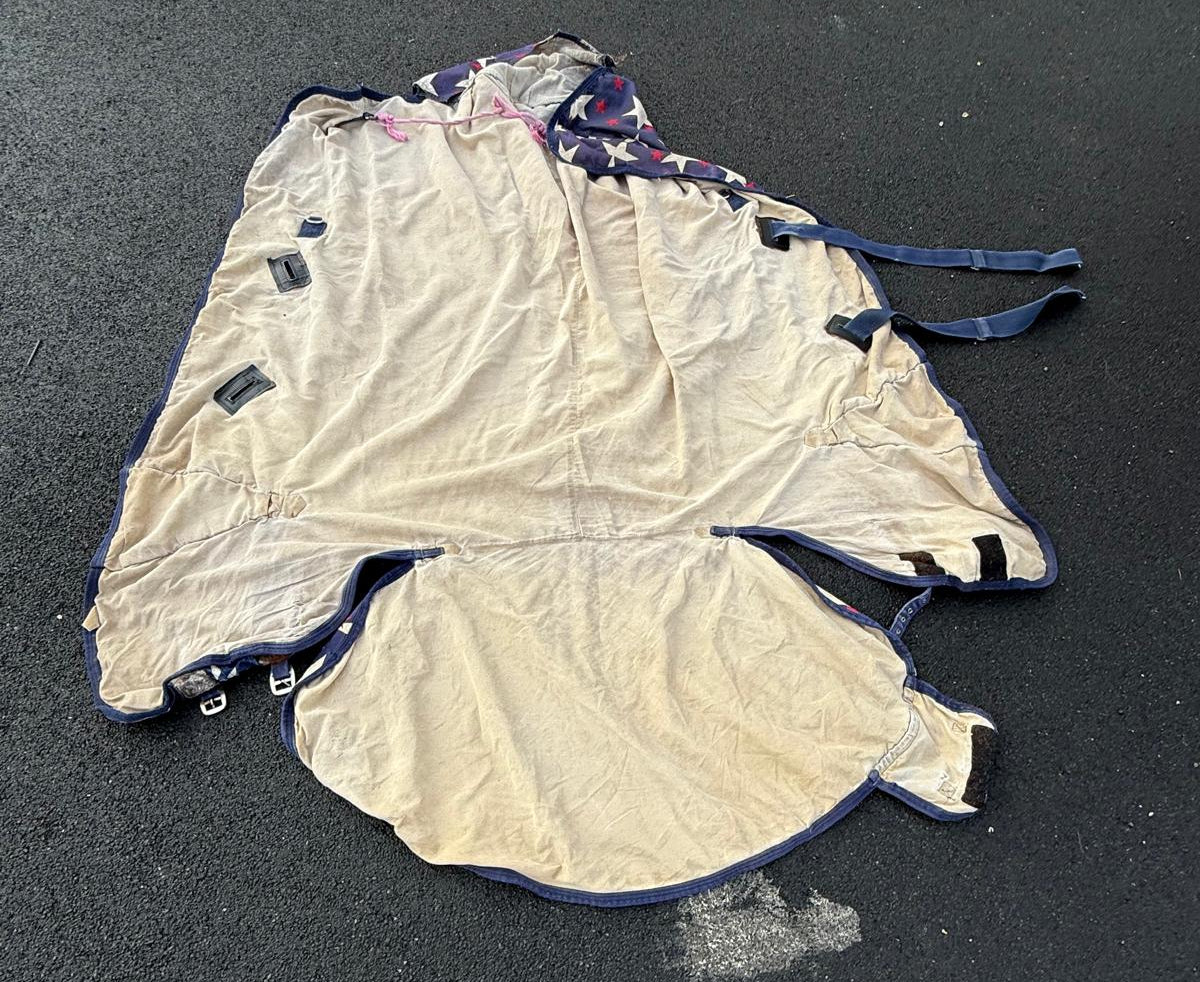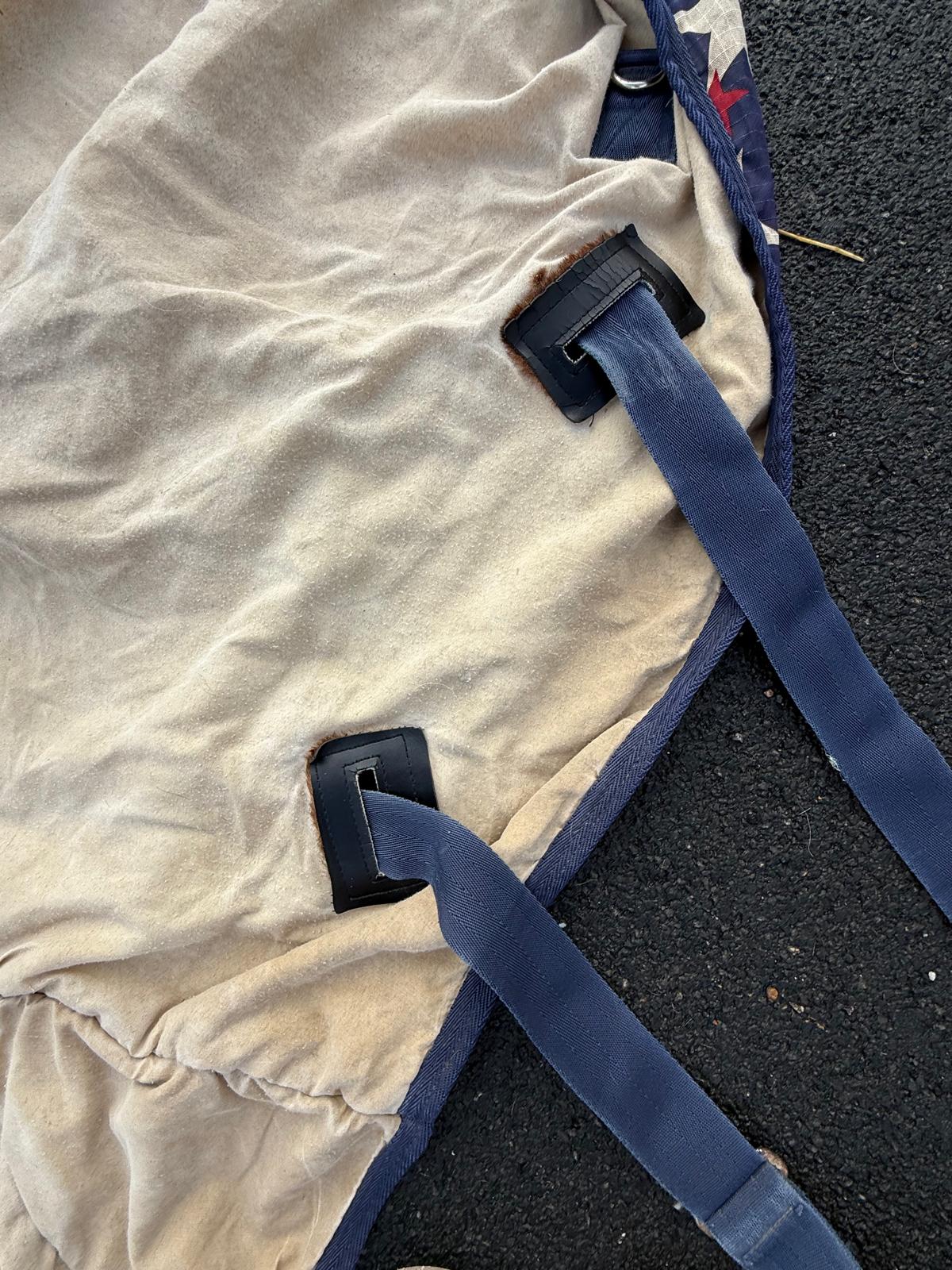 Well used older rug with all buckles and straps in working order. A few rips and snags to the lining. Is clean and ready to use we will remove as much of the hair as possible before posting. Please note due to the age of the rug it will not cope with heavy rain. But ideal for showers at shows or in the stable as a thin layer.