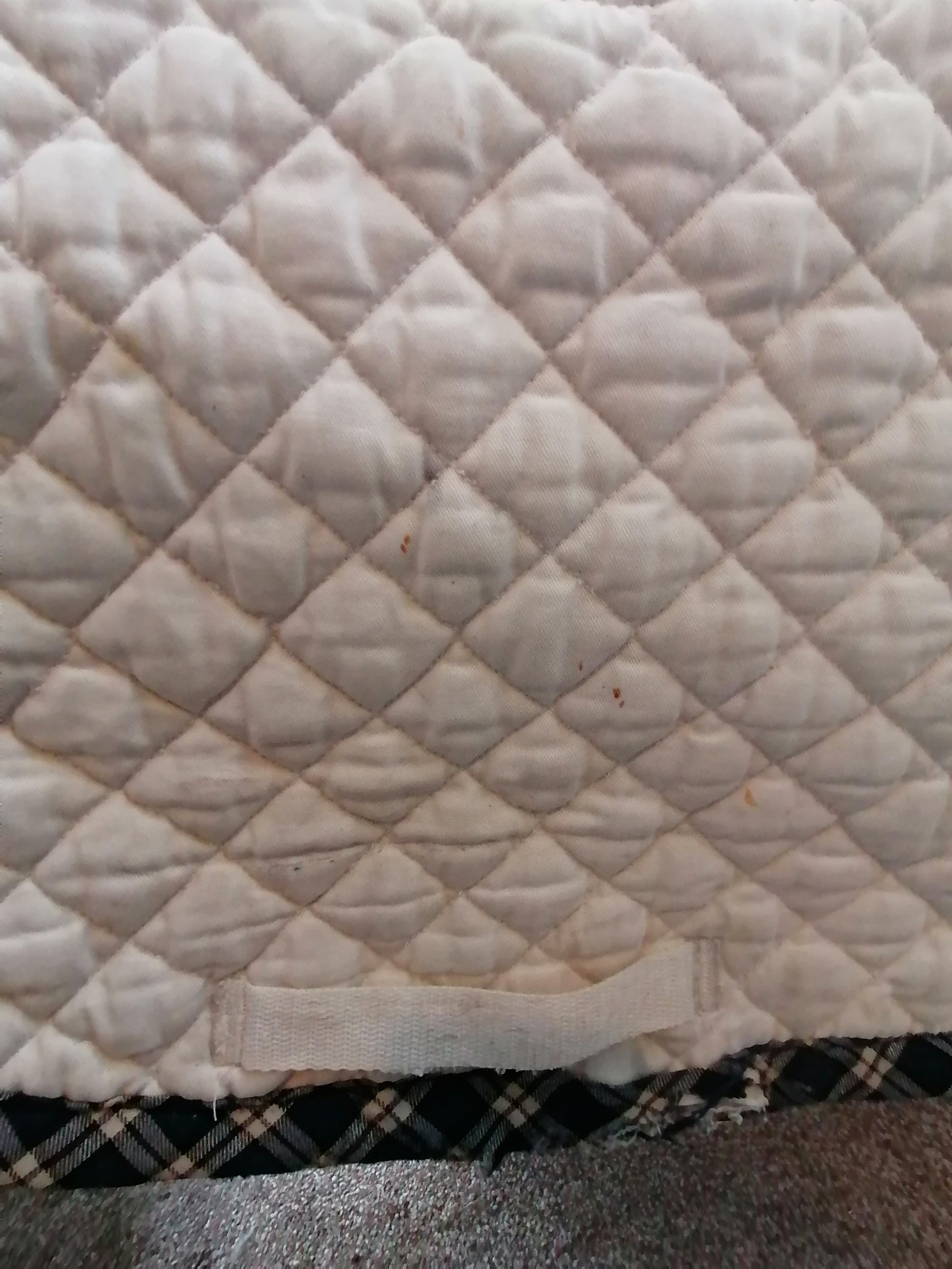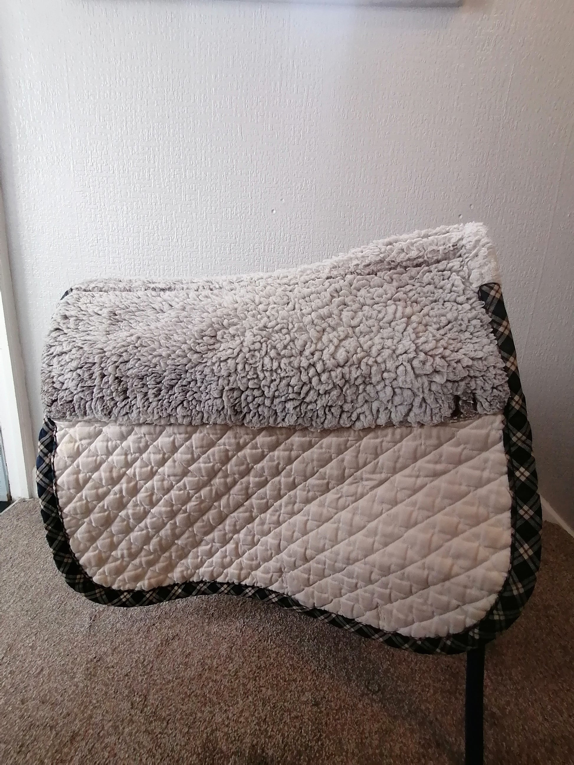 Full size unbranded GP saddle pad. Patterned edge some wear and tear to the edge by the girth area and some stains to both sides. Thick fleece padding underneath in good clean condition.