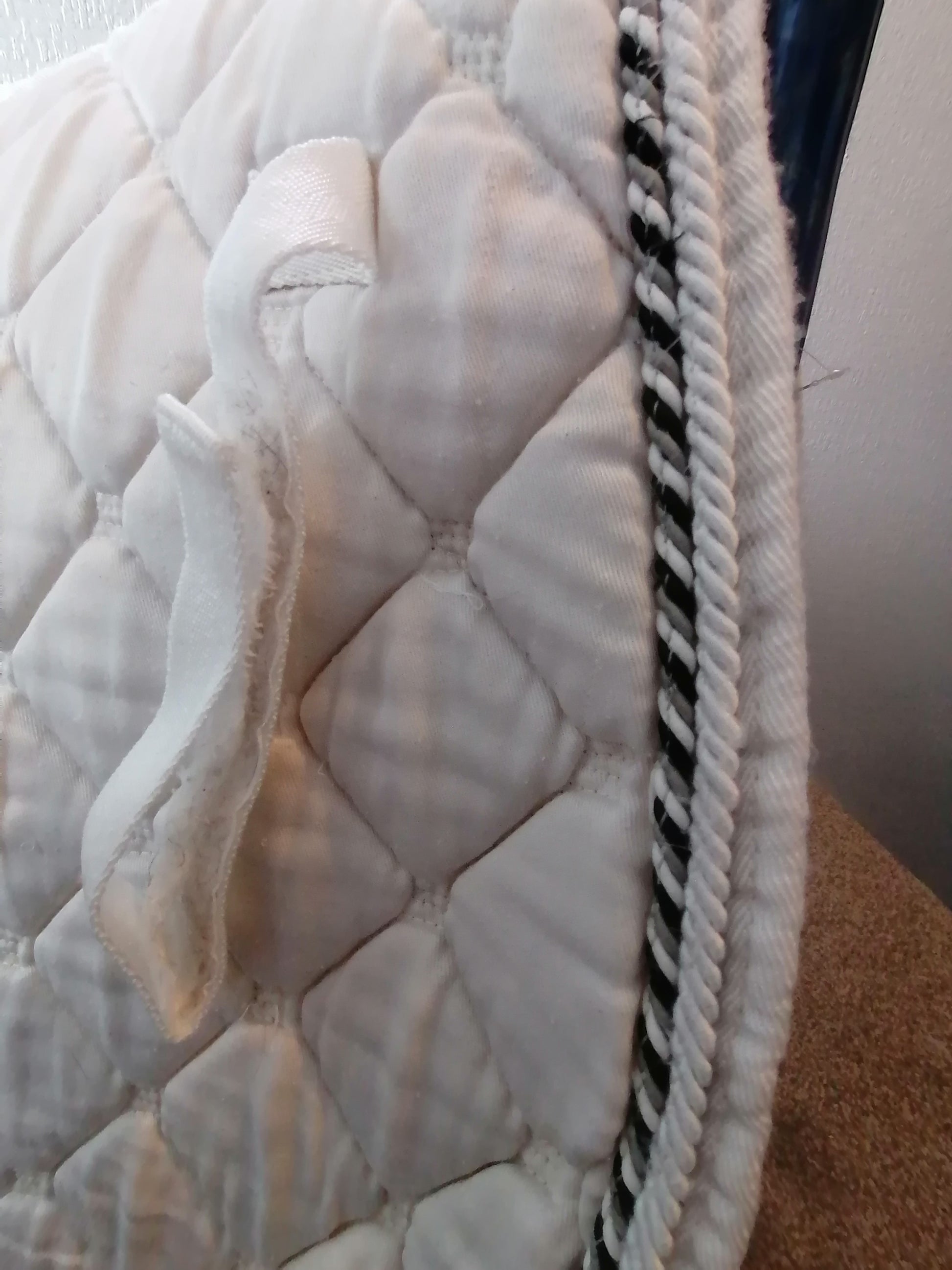 A well used thin white cotton pad, labelled full size but is smaller and more of a GP length so would suit ponies or more GP shaped saddles. Pad is very bobbled on both sides and underneath but is not overly noticeable when in use. Fab clean condition no stains or marks aside from a faded name to one of the straps. No stray hairs, washed and ready to go.