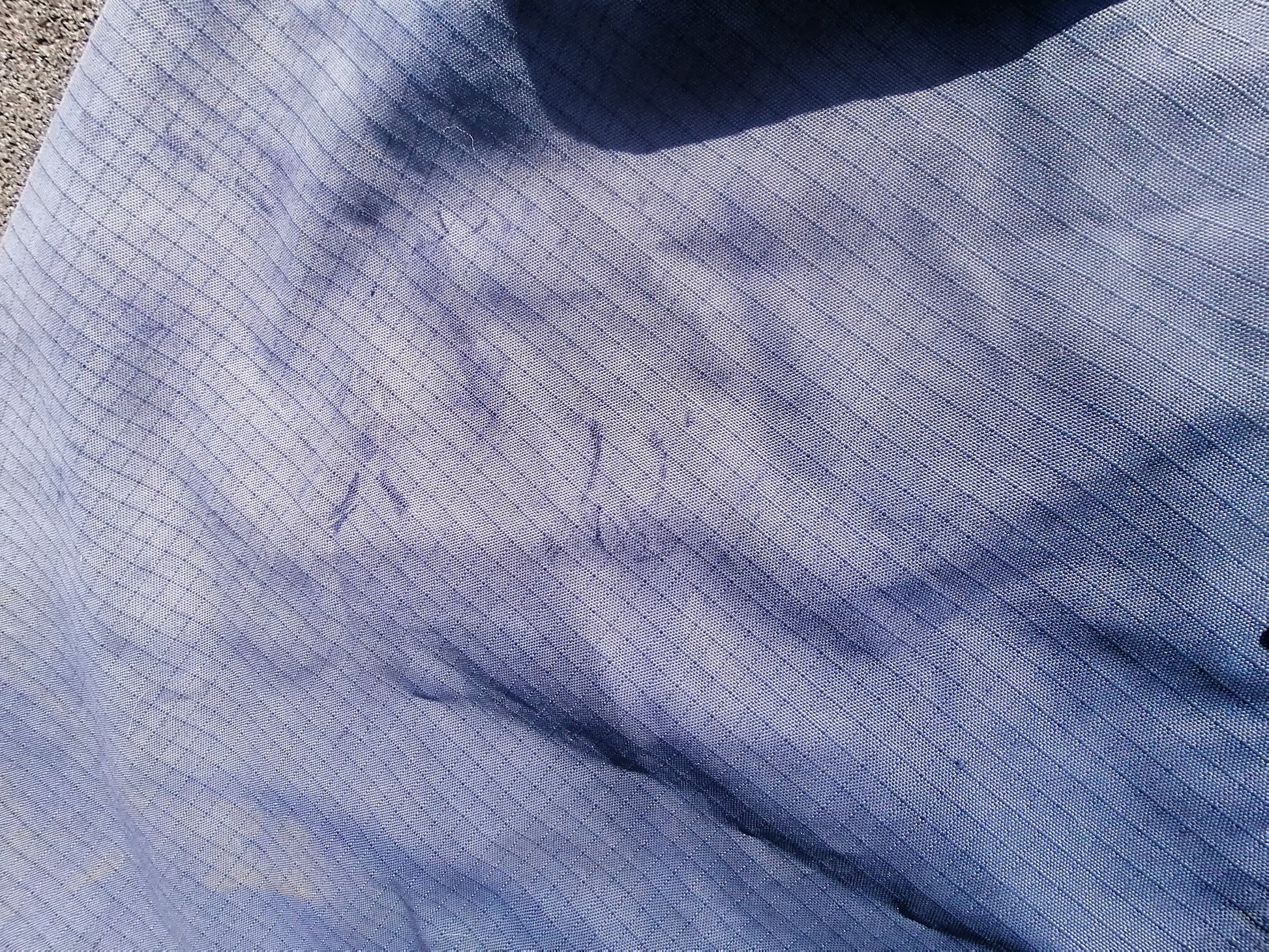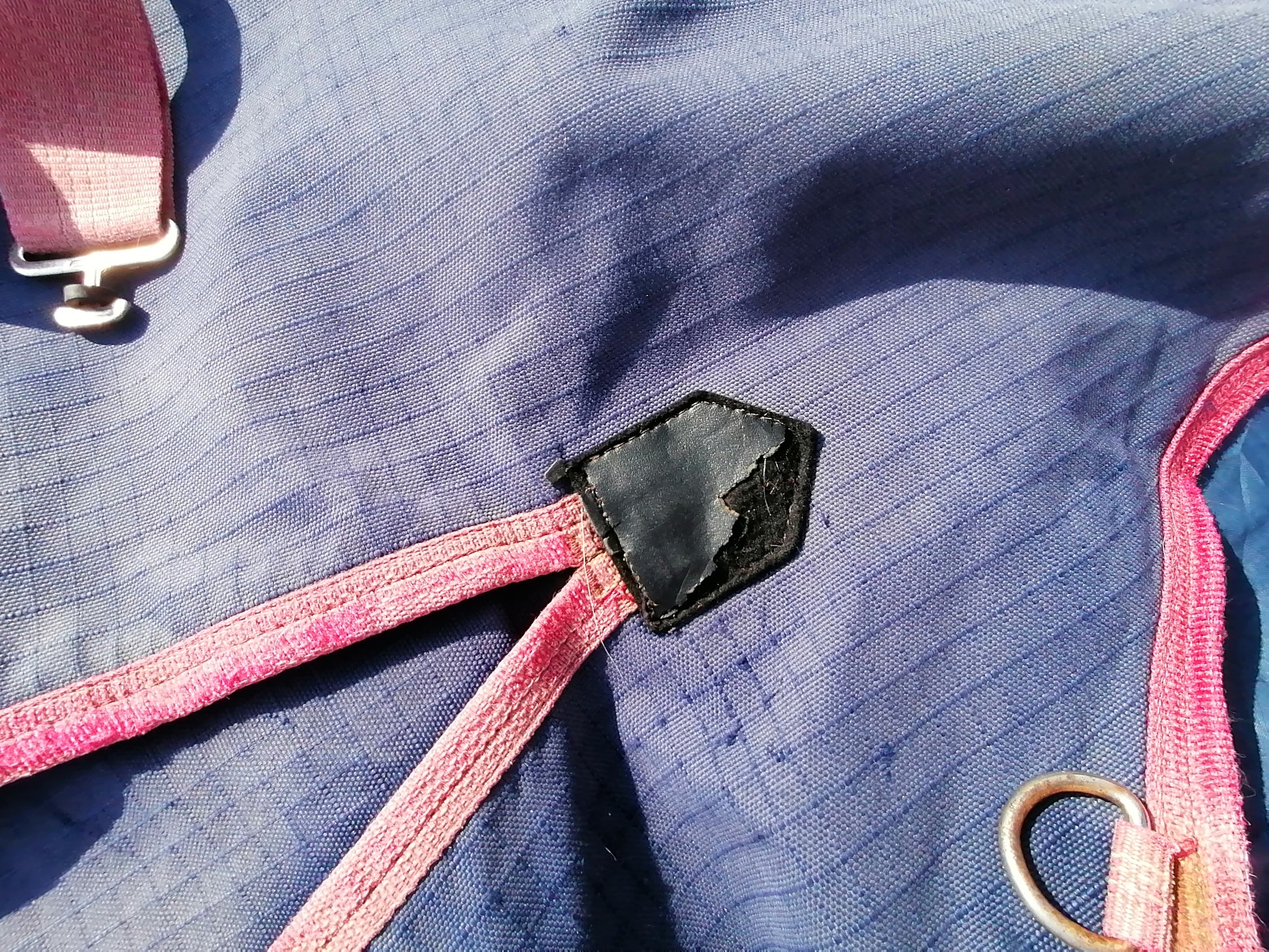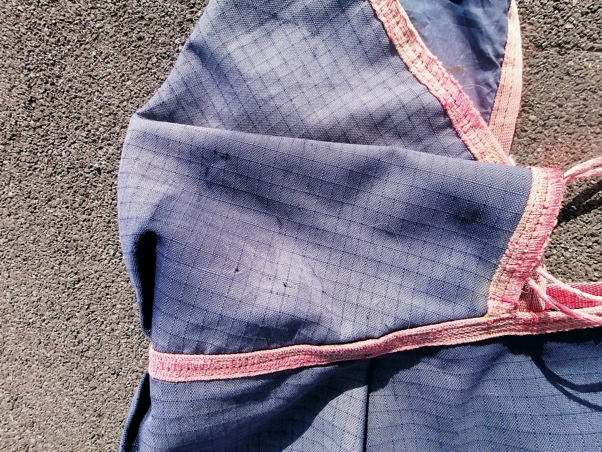 1200D outer shell has some fading from sun, snags in some places as shown with peeling to the leather like guard at the top of the shoulder gusset, rust to the buckles has been fitted with string as missing original leg/tail straps