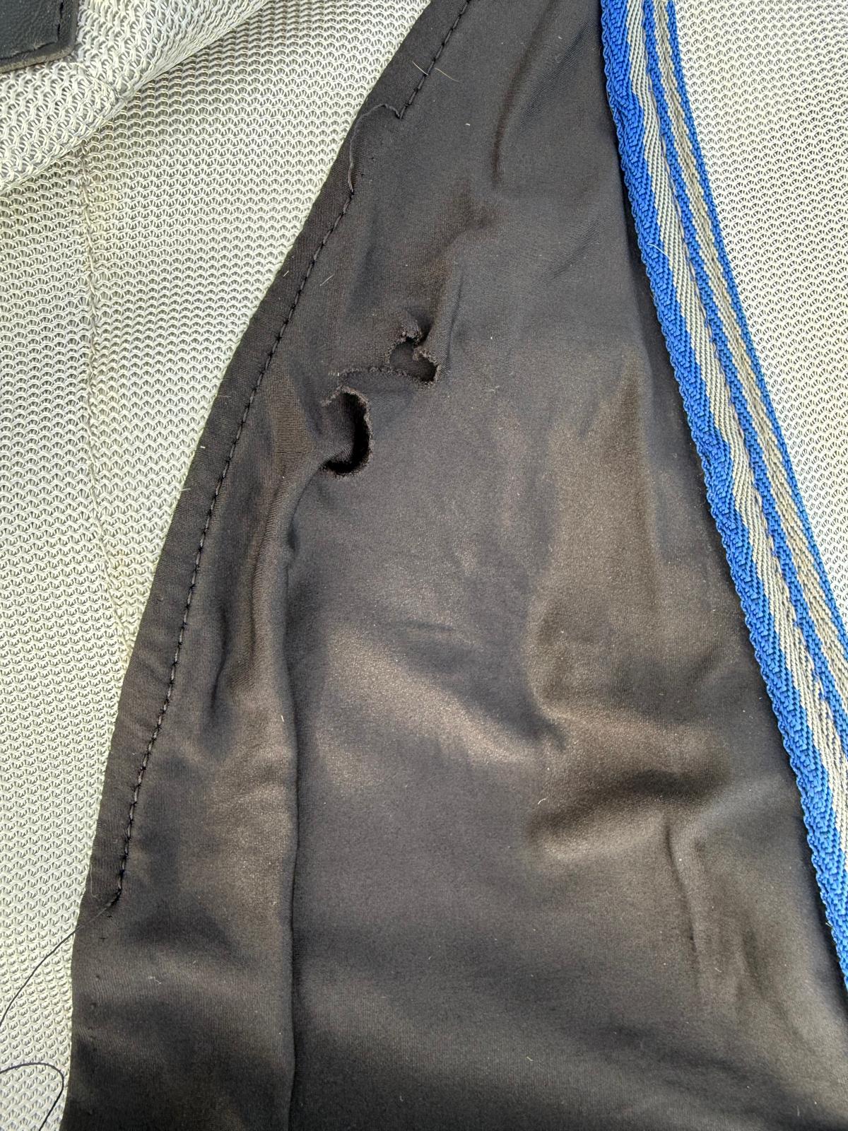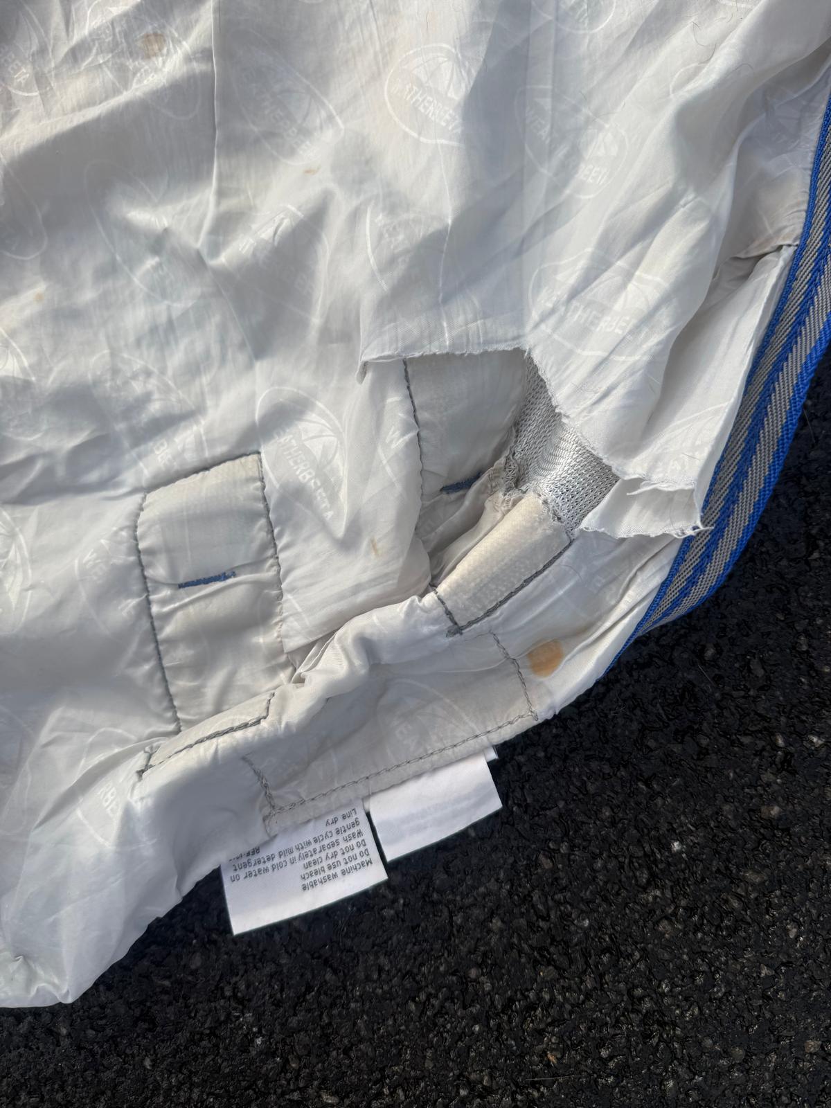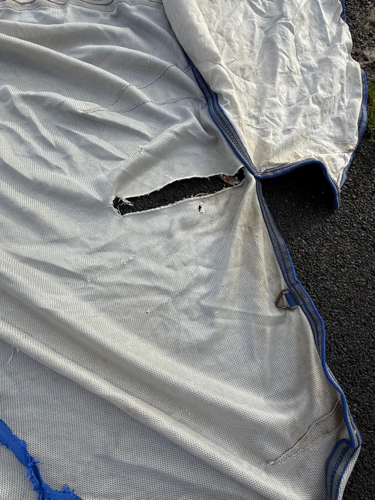 A well used rug with some damage but great for the rug wrecking type. It has a clip missing from the front but an extra has been provided to attach. Straps are all in working order with a belly flap. Does have some stains and a large rip to the rear on one side and to neck and chest. Has been washed ready to post.