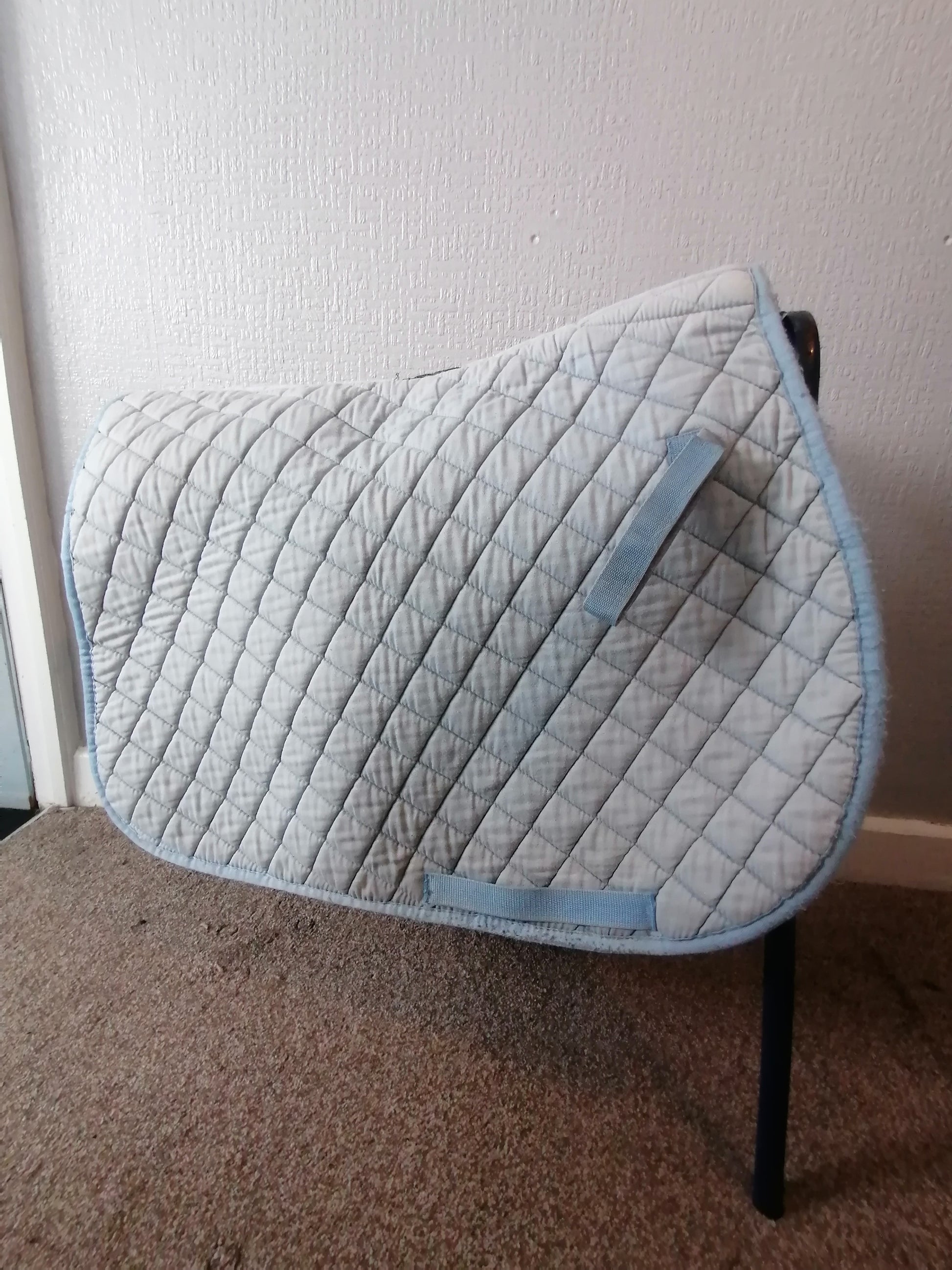 Very faded pale blue, no damage but does have bobbling to both sides. Full size GP style with added padding to the wither no stains but some discolouration to girth area, but is clean and ready to go.