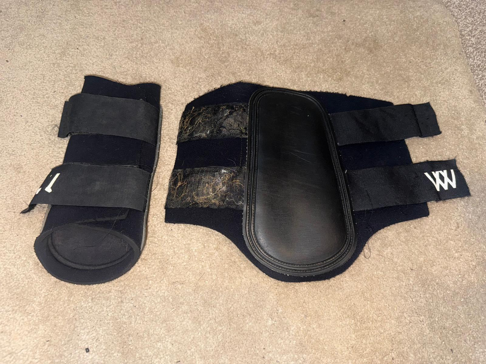 Woof Wear Brushing Boots Cob size well used boots that are clean and ready to use signs of wear to the strike pads but still durable for use in all disciplines.